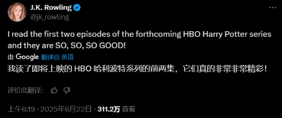 JK罗琳盛赞剧版《哈利波特》:前两集剧本真是太棒了!